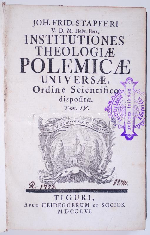 Joh.[ann] Frid[rich] Stapferi: Institutiones theologiae polemicae universae, ordine scientifico dispositae, tom. IV. Tiguri, 1756, apud Heideggerum et Socios. Eredeti, egészbőr kötésben, a címlapon vignettával, jó állapotban (az előzék- és címlapon a korábbi tulajdonosok bejegyzése, ill. pecsétje) /