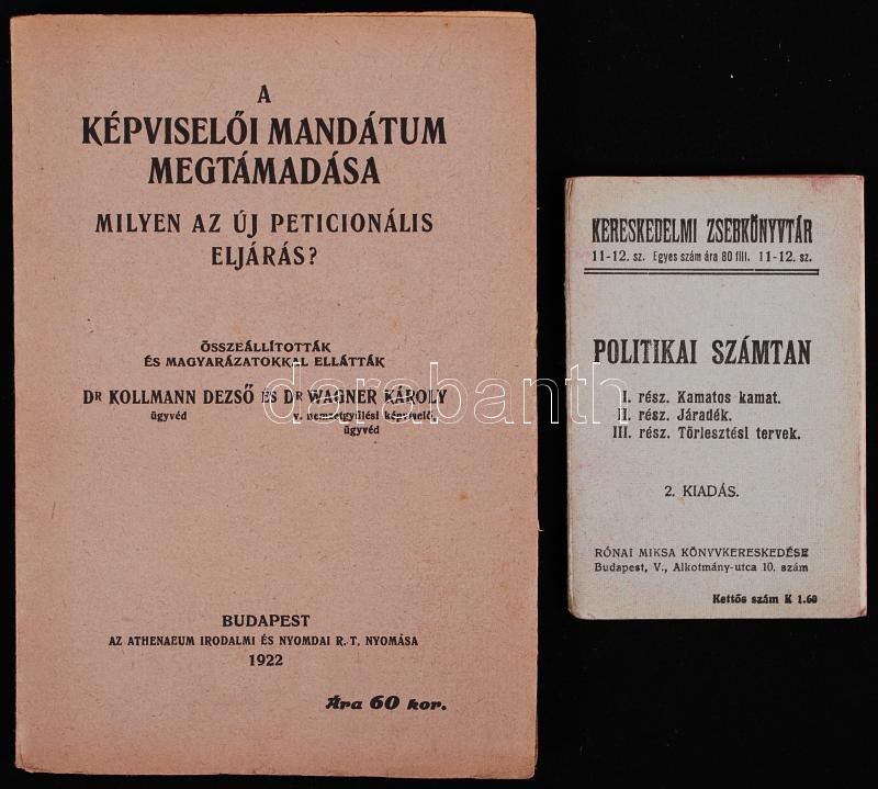 Leírás: Kollmann-Wagner: A képviselői mandátum megtámadása, Bp., 1922. + Politikai számtan.