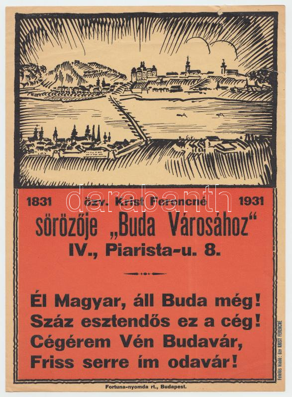 1931 Budapest V. Krist Ferencné sörözője Buda Városához plakát (sarok ... https://www.darabanth.com/hu/181-Gyorsarveres/181.0/Festmeny-mutargy-papirregiseg-egyeb/Reklam~200038/1931-Budapest-V-Krist-Ferencne-sorozoje-Buda-Varosahoz-plakat-sarok-szakadt-18x24-cm~II647811