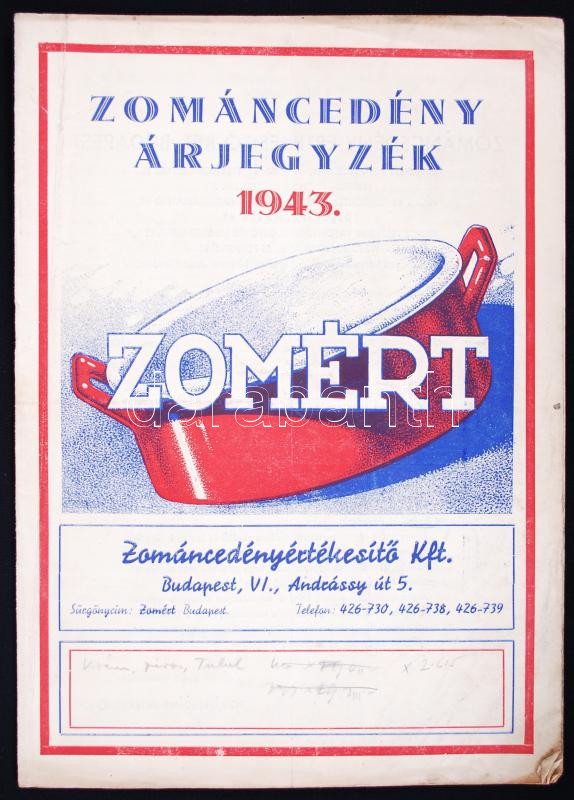 1943 Budapest VI., Zomért zománcedény-árjegyzék https://www.darabanth.com/hu/181-Gyorsarveres/181.0/Festmeny-mutargy-papirregiseg-egyeb/Reklam~200038/1943-Budapest-VI-Zomert-zomancedeny-arjegyzek~II646350