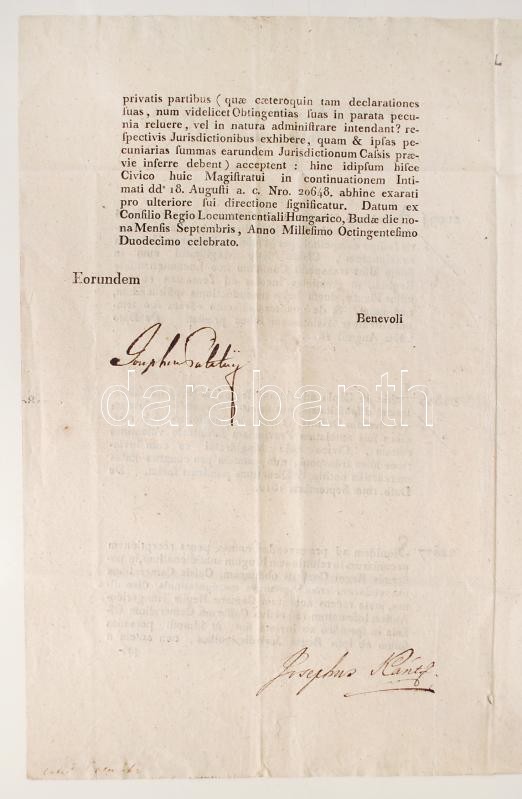 1812 helytartótanácsi leirat József nádor és Kántz József saját kezű aláírásával 2 nyomtatott oldalon / 1812 Ex offo letter of the Governing Council with autograph signature of Joseph palladin