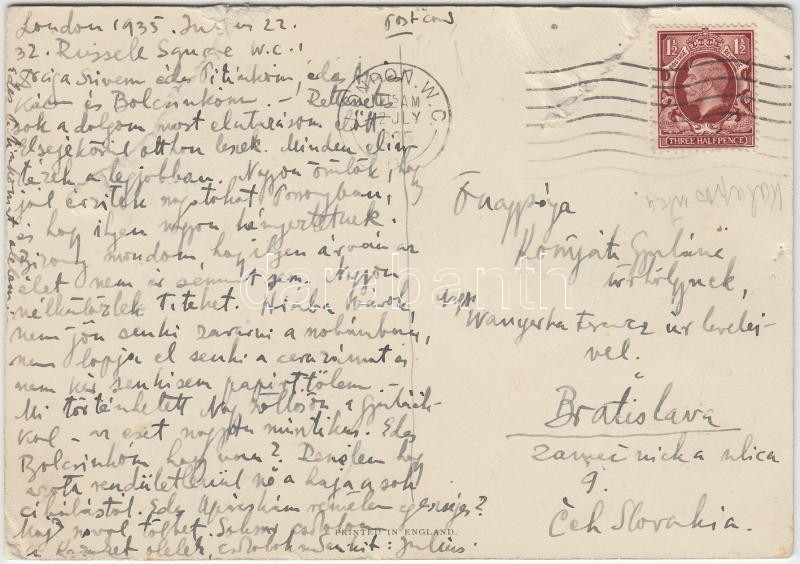 Leírás: 1935 Komjáti-Wanyerka Gyula festő saját kézzel írt képeslapja Londonból (ahová ösztöndíjjal került) feleségének, több kisebb szakadás