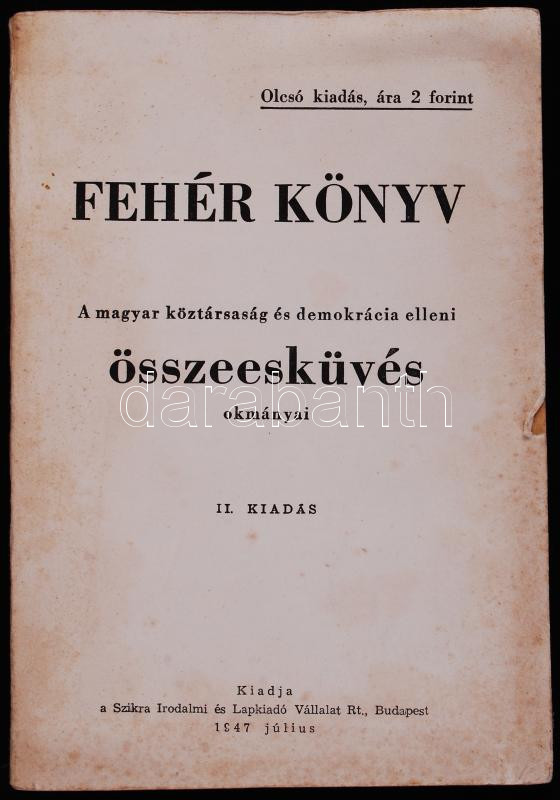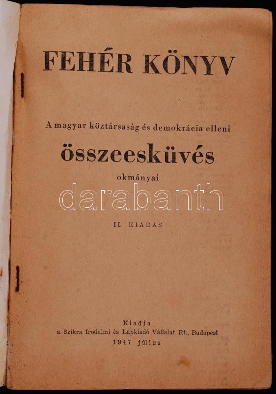 1947 Fehér Könyv - A magyar köztársaság és demokrácia elleni összeeskü... https://www.darabanth.com/hu/181-Gyorsarveres/181.0/Festmeny-mutargy-papirregiseg-egyeb/Tortenelmi-dokumentumok-keziratok-erdekessegek~200035/1947-Feher-Konyv--A-magyar-koztarsasag-es-demokracia-elleni-osszeeskuves-okmanyai-II-ki~II634066