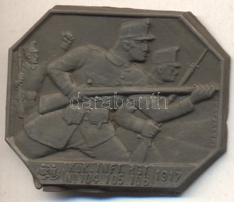 Osztrák-Magyar Monarchia 1917. "K.u.K. 104. 105. 106-os Gyalogezr... https://www.darabanth.com/hu/181-Gyorsarveres/181.0/Numizmatika/Militaria~1000398/Osztrak-Magyar-Monarchia-1917-KuK-104-105-106-os-Gyalogezred-cink-sapkajelveny-29x42mm-k~II648686