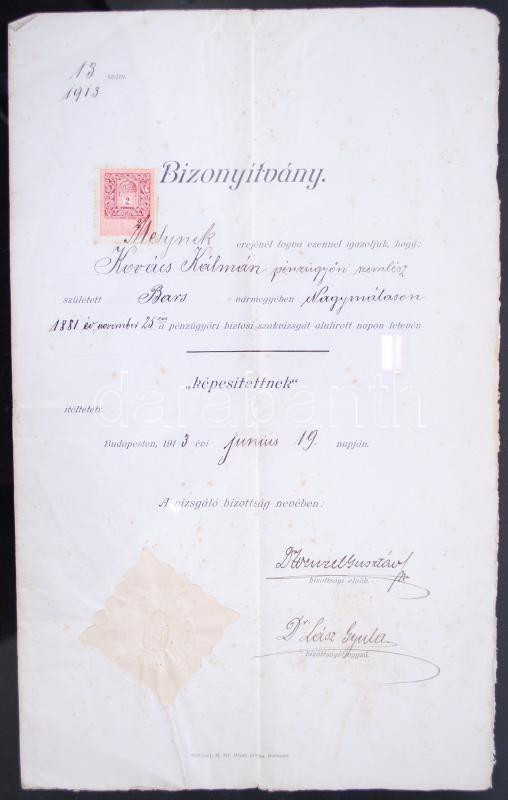Leírás: 1913 Pénzügyőri bizonyítvány Wenczel Gusztáv jogtudós saját kezű aláírásával