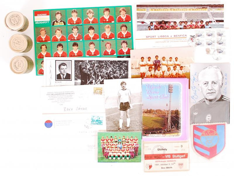 1953-1991 Labdarúgástörténeti gyűjtemény: Baróti Lajos fotólapja aláírásával, Mészöly Kálmán, Salamon József aláírásai, diafilmek a londoni 6:3-ról, különböző csapatok fotói, leporellók, Vasas-jelvény, stb.