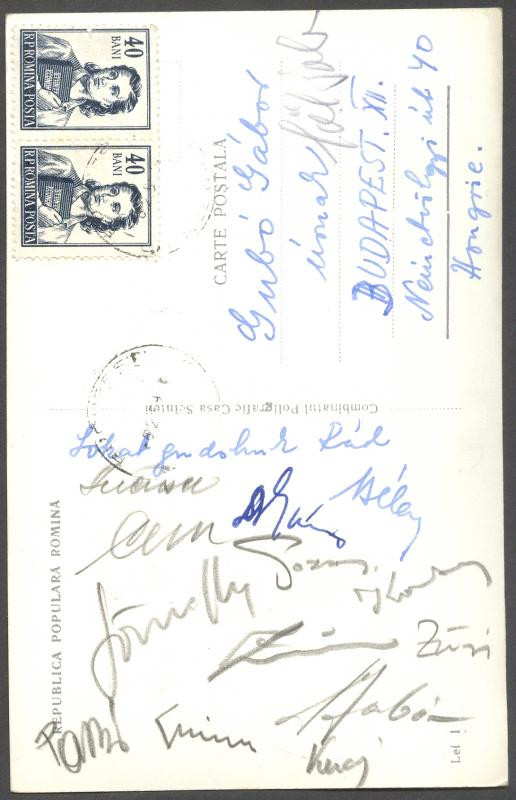 Leírás: 1959 Magyar jégkorong-válogatott tagjai által küldött képeslap a játékosok aláírásaival Bukarestből