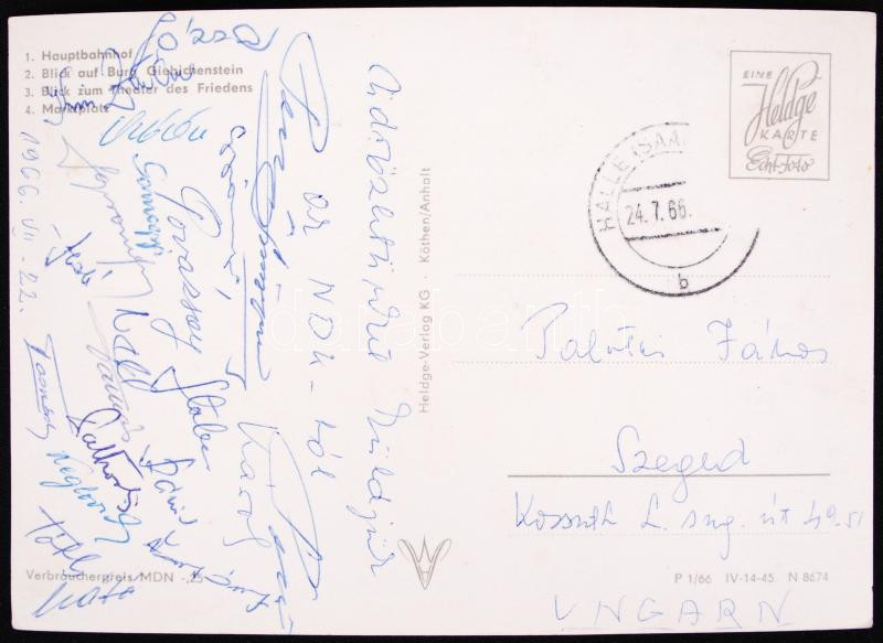1966 Halle képeslap hátoldalán sportolók és olimpikonok aláírásával https://www.darabanth.com/hu/182-Gyorsarveres/182.0/Festmeny-mutargy-papirregiseg-egyeb/Alairas~400018/1966-Halle-kepeslap-hatoldalan-sportolok-es-olimpikonok-alairasaval~II654728
