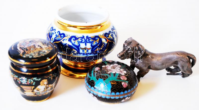 Leírás: Vegyes mini bolha tétel: Jelzett porcelán vázácska és tégely, zománc ékszeres dobozka, ólom sérült tacskó