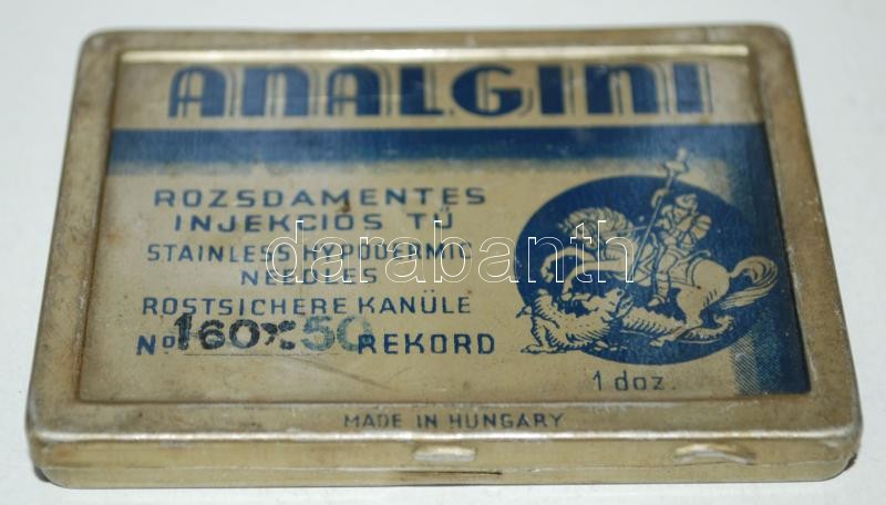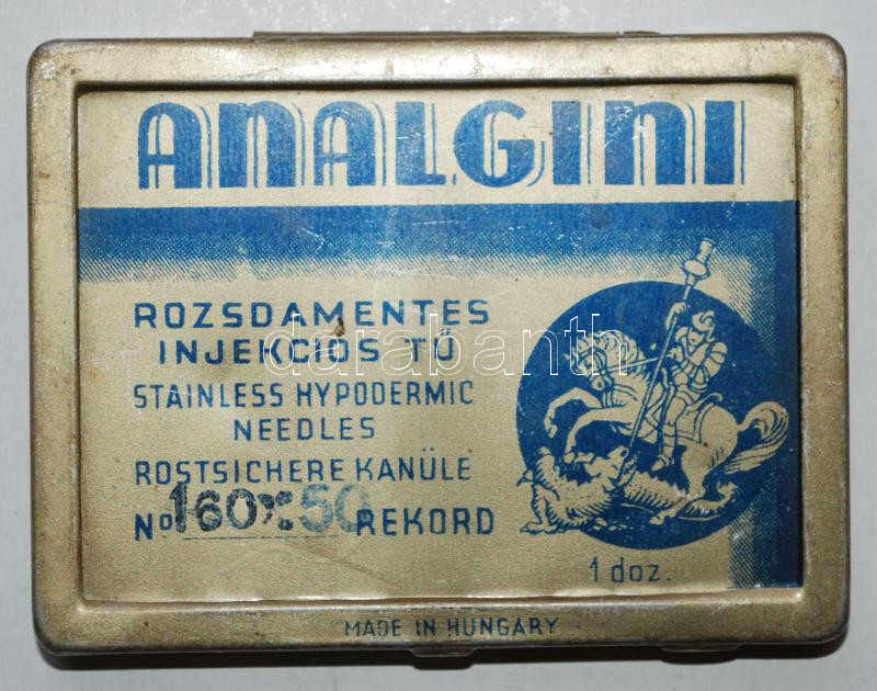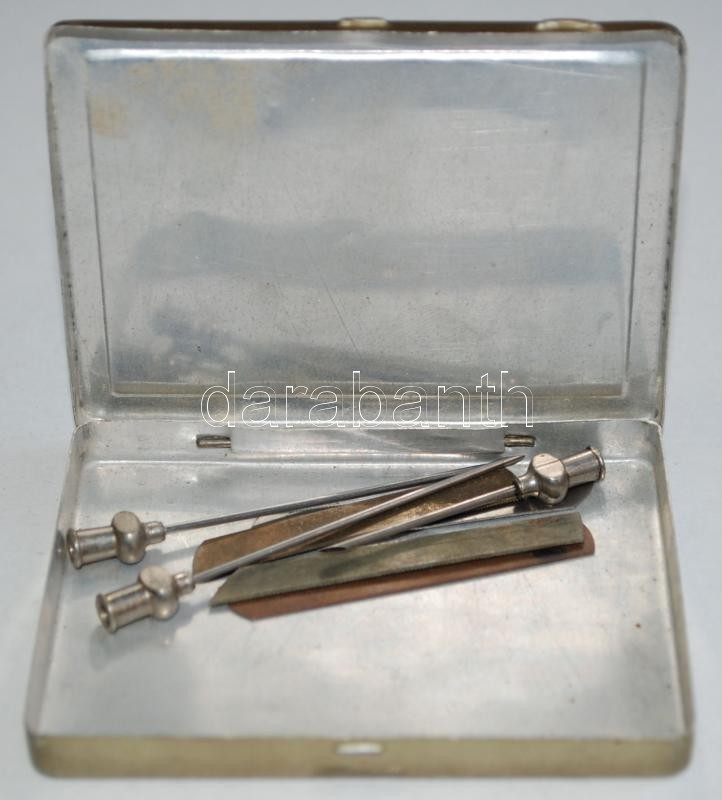cca 1920 3db Analgini magyar gyártmányú rozsdamentes acél injekciós tű eredeti dobozában 4db régi ampullareszelővel /