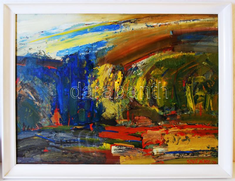Leírás: Szabó János (1942-): Őszi táj. Olaj, farost, jelzett, üvegezett keretben 66×86 cm