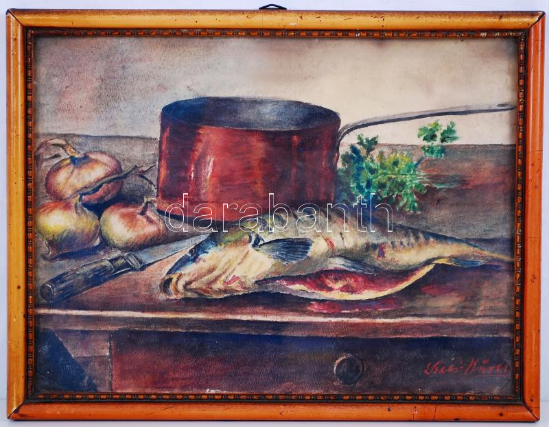Leírás: Szabó jelzéssel: Halas csendélet. Akvarell, papír, üvegezett keretben 24×32 cm
