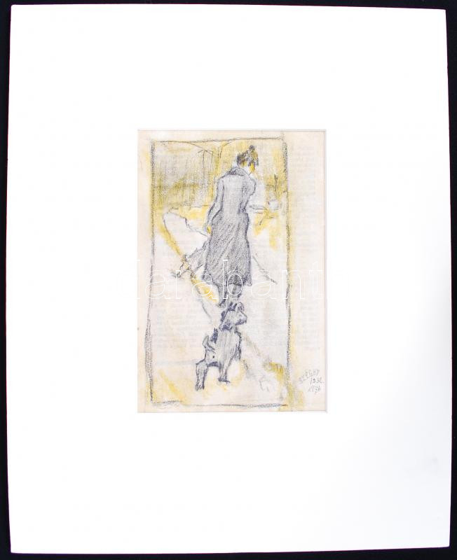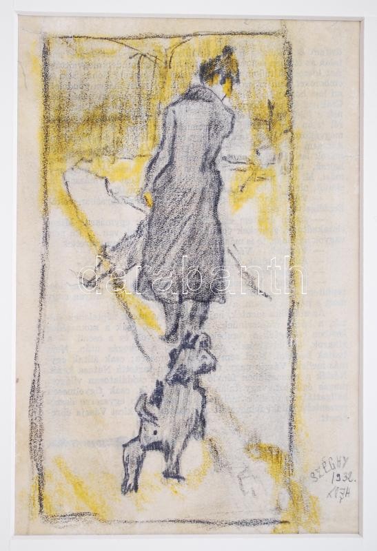 Leírás: Széghy Hédy jelzéssel: Nő kutyákkal 1932. Ceruza, papír, paszpartuban, 19×13 cm