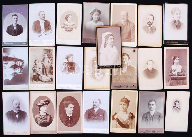 Leírás: 1880-1930 21db keményhátú fotó - leletek az erdélyi fotográfia történetéből: vizitkártyák aradi, temesvári, kolozsvári, nagykárolyi, nagyváradi műtermekből