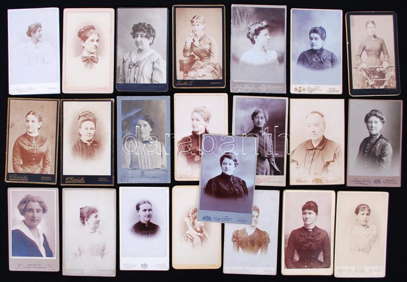 Leírás: 1880-1930 22db keményhátú fotó hölgyekről, klf műtermekből, vizitkártya méretben /