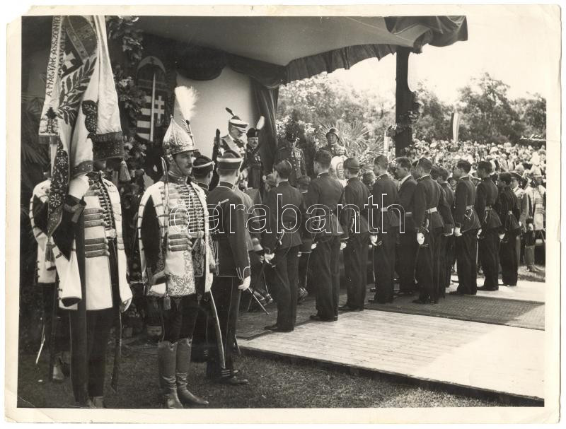 cca 1940 Horthy Miklós vitézeket avat a Margitszigeten, koronaőrökkel fotó kis sérülésekkel Szántó fotó /