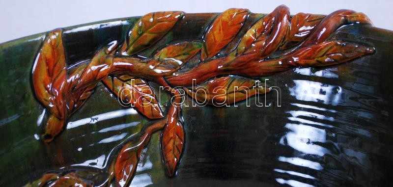 Leírás: Pápai Kata (keramikus): Leveles nagy kaspó. Mázas gazdagon díszített kerámia, jelzett, hibátlan, m:18 cm, d:37 cm