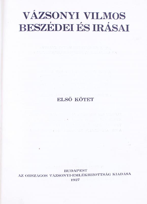 Vázsonyi Vilmos beszédei és írásai I-II. Gróf Apponyi Albert, gróf Esterházy Móric és Bárczy István előszavával. Bp., 1927, Országos Vázsonyi-Emlékbizottság. Kiadói kötésben (kötés kissé kopottas)