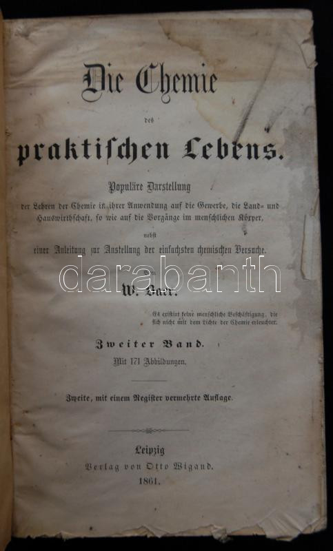 Baer, W,: Die Chemie des praktischen Lebens. Populäre Darstellung der Lehren der Chemie in ihrer Anwendung auf die Gewerbe, die Land- und Hauswirthschaft... II. Band. Leipzig, 1861. Otto Wigand Vlg. 1214p. Néhány lap foltos / Some pages are stained