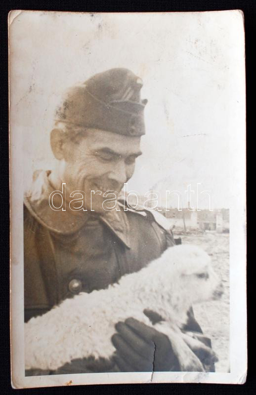 1944 Magyar katona báránykával, fotólap https://www.darabanth.com/hu/182-Gyorsarveres/182.0/Festmeny-mutargy-papirregiseg-egyeb/Militaria~400025/1944-Magyar-katona-baranykaval-fotolap~II654281