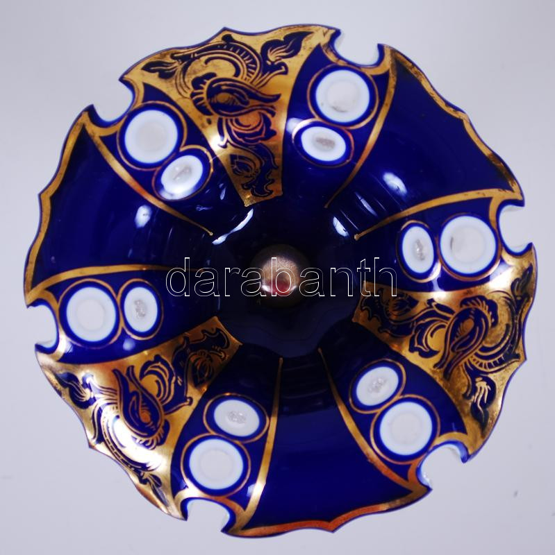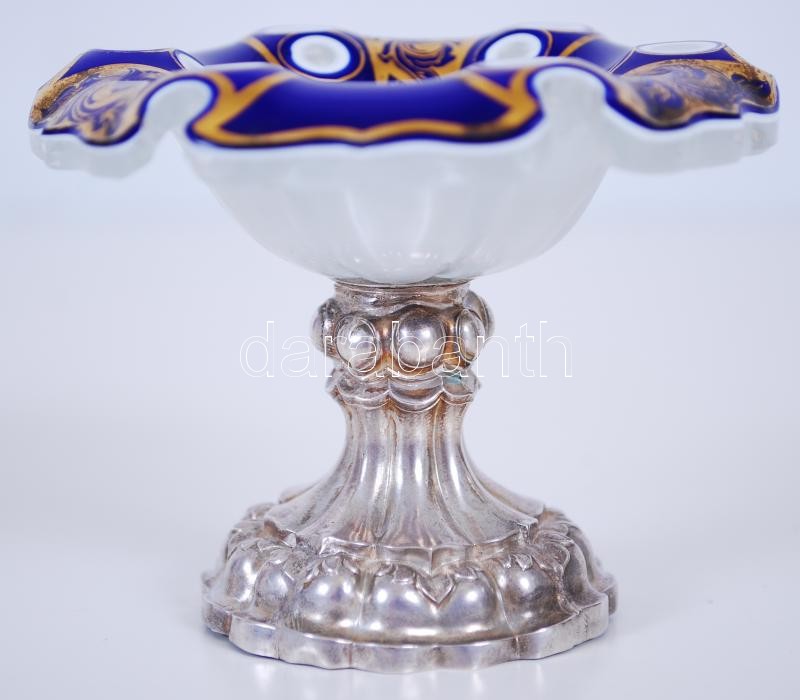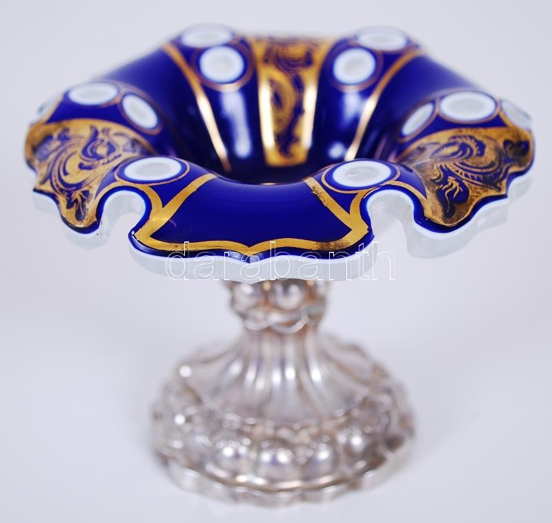 cca 1850 13 latos (812/1000), poncolt ezüst (Ag) talpon álló kis fűszertartó, színtelen és kék-fehér réteges, csiszolt, aranyozott, fodros üvegtálkával (az üvegen, alul apró sérülés) /