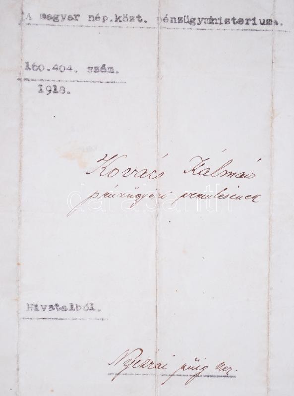 Leírás: 1918 Pénzügyi szemlész kinevezés Szende Pál, a Károlyi kormány pénzügyminiszterének aláírásával