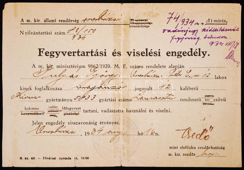Leírás: 1937 Orosházi rendőrkapitányság által kiállított fegyvertartási engedély