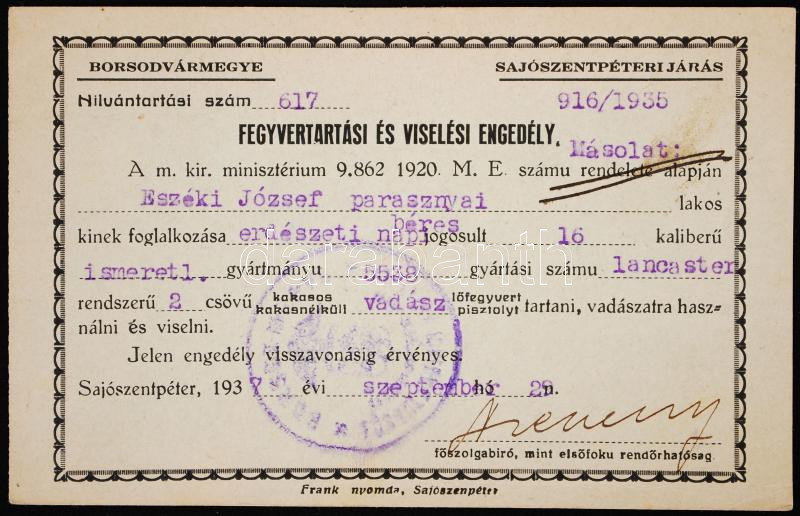 1937 Sajószentpéteri rendőrkapitányság által kiállított fegyvertartási... https://www.darabanth.com/hu/182-Gyorsarveres/182.0/Festmeny-mutargy-papirregiseg-egyeb/Okmanyok~400016/1937-Sajoszentpeteri-rendorkapitanysag-altal-kiallitott-fegyvertartasi-engedely~II654489