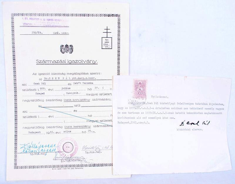 Leírás: 1941, 1944 Származási igazolvány az egyik honvédségi (A4)
