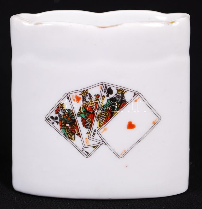 Leírás: Kártyalapokkal díszített, jelzett Drasche porcelán fogpiszkálótartó /