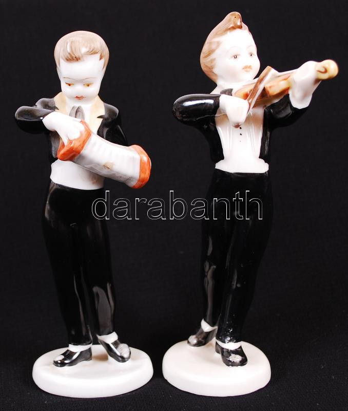 Leírás: Zenélő kisfiúk. 2db, kézzel festett, jelzett Hollóházi porcelán figura, egyik sérült /