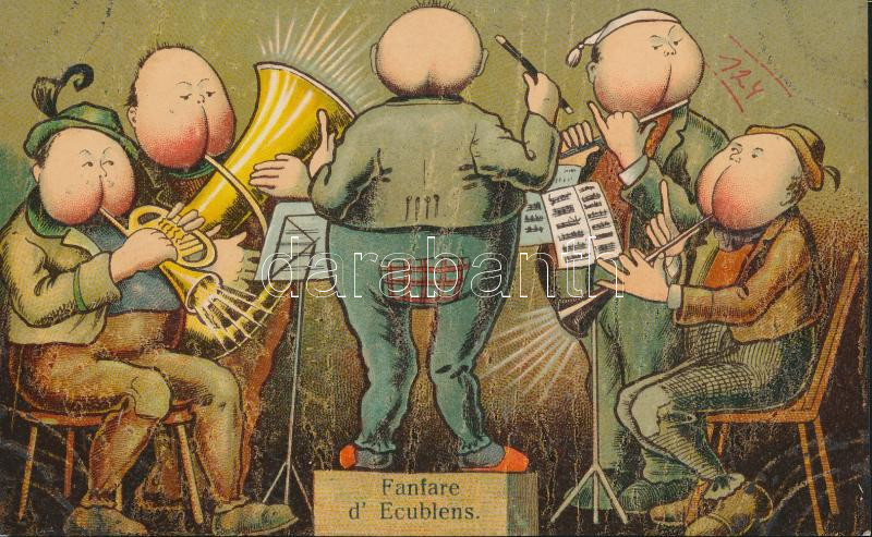 Fanfare d' Ecublens / Fanfare of Ecublens, Wind instruments, trum... https://www.darabanth.com/hu/182-Gyorsarveres/182.0/Kepeslapok/Humor~400353/Fanfare-d-Ecublens-Fanfare-of-Ecublens-Wind-instruments-trumpet-humour-litho~II538413