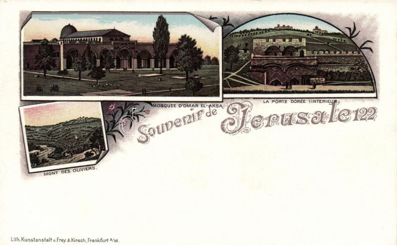 Leírás: Jerusalem, Mont des Oliviers, Mosquee D'Omar El-Aksa, Porte Dorée / mountain, mosque, gate, floral litho