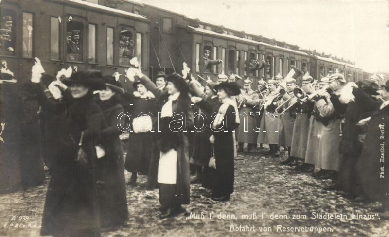 Departure of German reserve troops, WWI, "Muss i denn..." fo... https://www.darabanth.com/hu/182-Gyorsarveres/182.0/Kepeslapok/Katonai~400361/Departure-of-German-reserve-troops-WWI-Muss-i-denn-folk-song-quote-small-tear~II652163