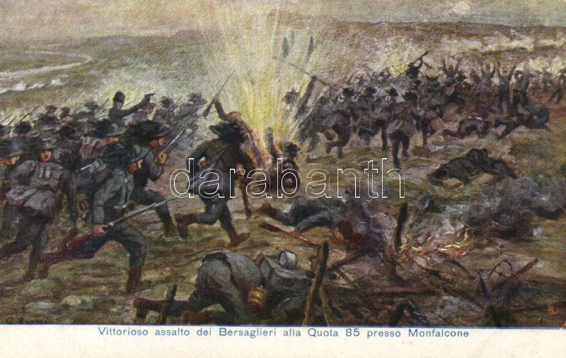 Italian infantry unit, battle of Monfalcone, s: G. Grossi https://www.darabanth.com/hu/182-Gyorsarveres/182.0/Kepeslapok/Katonai~400361/Italian-infantry-unit-battle-of-Monfalcone-s-G-Grossi~II541178