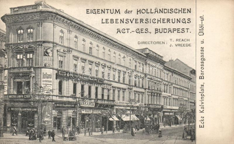 Leírás: Budapest VIII. Kálvin tér, Hollandi életbiztosító társaság, Magyar fém és lámpaáru gyár, Makó Mihály üzlete