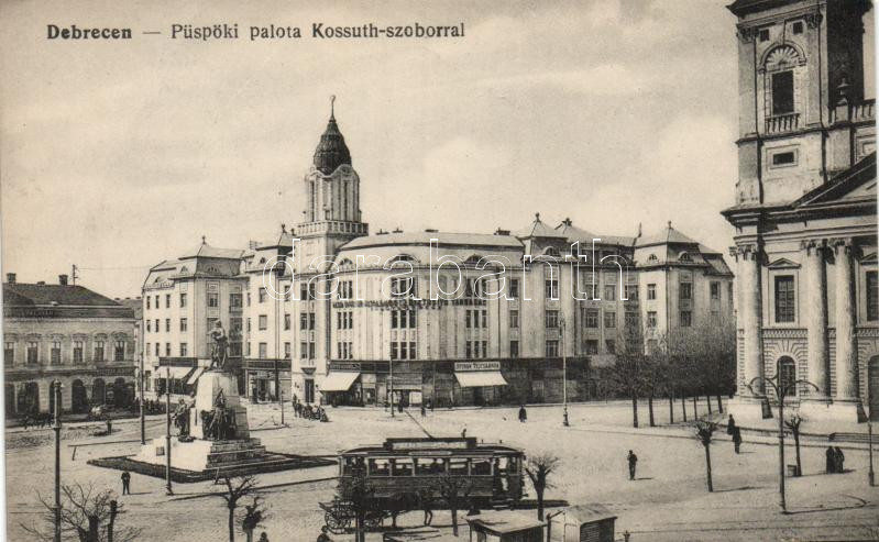 Debrecen Püspöki palota a Kossuth szoborral, Bottó Kornél és Deutsch Albert üzletei, az Első Magyar Biztosító Társaság Főügynöksége, Otthon tejcsarnok, villamos