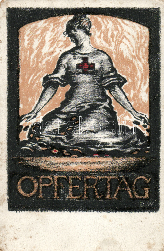 Opfertag 1917, woman with a red cross, propaganda s: D. W. (fl) https://www.darabanth.com/hu/182-Gyorsarveres/182.0/Kepeslapok/Reklam~400384/Opfertag-1917-woman-with-a-red-cross-propaganda-s-D-W-fl~II511094