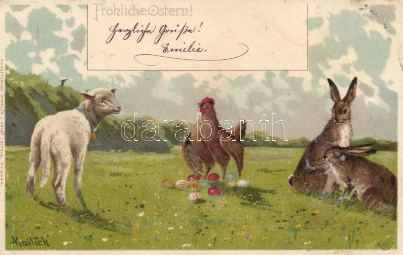 Easter, chicken, lamb and rabbits, litho, s: Mailick (small tear) https://www.darabanth.com/hu/182-Gyorsarveres/182.0/Kepeslapok/Udvozlolap~400404/Easter-chicken-lamb-and-rabbits-litho-s-Mailick-small-tear~II652133