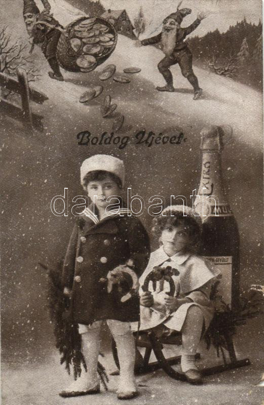 New Year, children, dwarfs with money bag, champagne (b) https://www.darabanth.com/hu/182-Gyorsarveres/182.0/Kepeslapok/Udvozlolap~400404/New-Year-children-dwarfs-with-money-bag-champagne-b~II650830