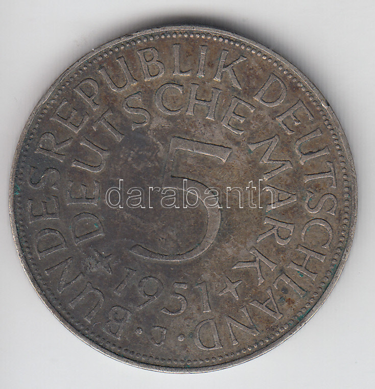 GFR 1951J 5 Mark Ag C:VF https://www.darabanth.com/hu/182-Gyorsarveres/182.0/Numizmatika/Kulfoldi-fem-es-ezustpenzek~400433/NSZK-1951J-5M-Ag-T2--3Cbr3EGFR-1951J-5-Mark-Ag-CVF~II572375