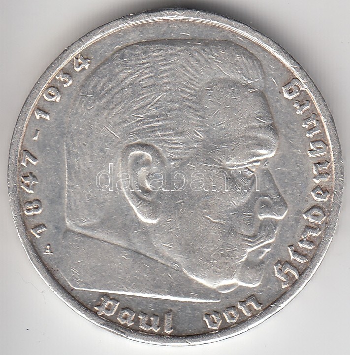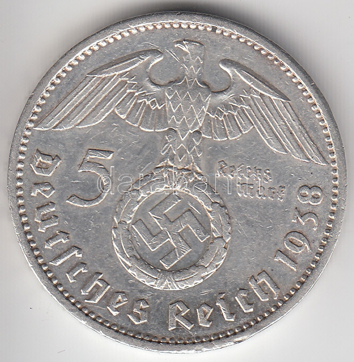 German Thir... https://www.darabanth.com/hu/182-Gyorsarveres/182.0/Numizmatika/Kulfoldi-fem-es-ezustpenzek~400433/Nemet-3-Birodalom-1938A-5M-Ag-Hindenburg-T2--3Cbr3EGerman-Third-Reich-1938A-5-Marks-Ag-Hindenbu~II651890