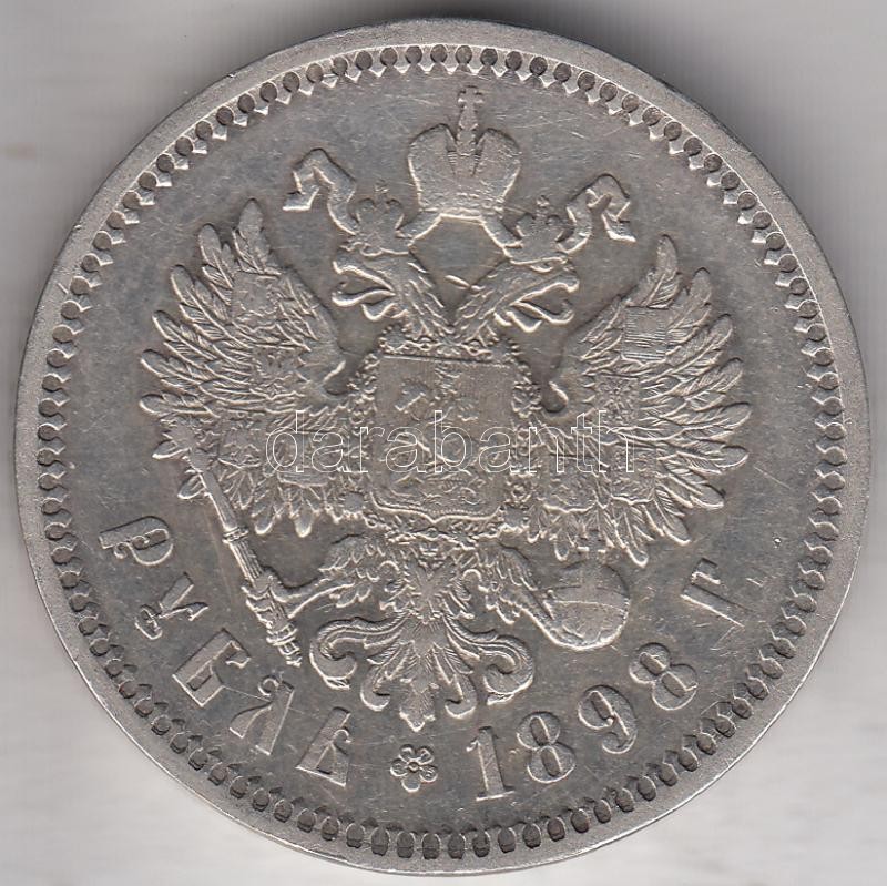 Russia 1898. 1 ... https://www.darabanth.com/hu/182-Gyorsarveres/182.0/Numizmatika/Kulfoldi-fem-es-ezustpenzek~400433/Oroszorszag-1898-1R-Ag-II-Miklos-T2-3--3Cbr3ERussia-1898-1-Ruble-Ag-Nicholas-II-Ag-CVF-F~II654546