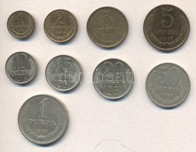 Soviet Un... https://www.darabanth.com/hu/182-Gyorsarveres/182.0/Numizmatika/Kulfoldi-fem-es-ezustpenzek~400433/Szovjetunio-1961-72-1k--1R-osszesen-9db-kulonfele-T1-2-2--3Cbr3ESoviet-Union-1961-72-1-kopek~II594652