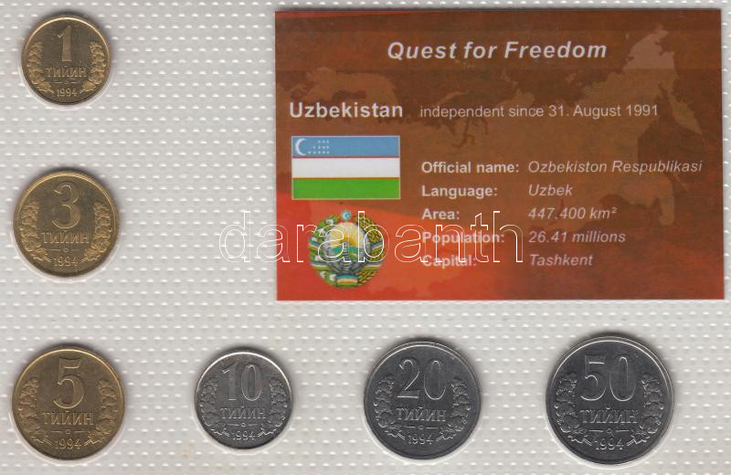 Uzbekistan 1994.... https://www.darabanth.com/hu/182-Gyorsarveres/182.0/Numizmatika/Kulfoldi-fem-es-ezustpenzek~400433/Uzbegisztan-1994-1T--50T-6klf-laminalt-szettben-T1-3Cbr3EUzbekistan-1994-1-Tiyin--50-Tiyin-6-~II652824