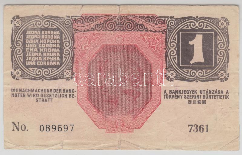 1917. 1K "7361" tévnyomat, csak alapnyomattal! T:III- https://www.darabanth.com/hu/182-Gyorsarveres/182.0/Numizmatika/Magyar-bankjegyek~400428/1917-1K-7361-tevnyomat-csak-alapnyomattal-TIII-~II655734