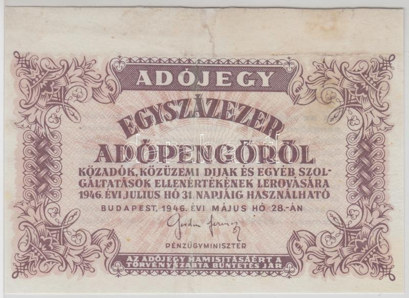 Leírás: 1946. 100.000AP felső ívszéllel és hiányzó hátlapi alapnyomattal! T:restaurált