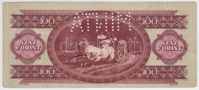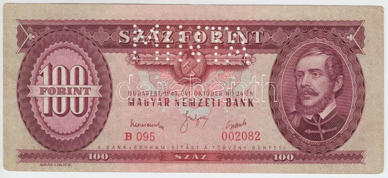 Leírás: 1949. 100Ft "MINTA" perforációval "B 095" sorozatszámmal T:II- lekerekített sarkokkal