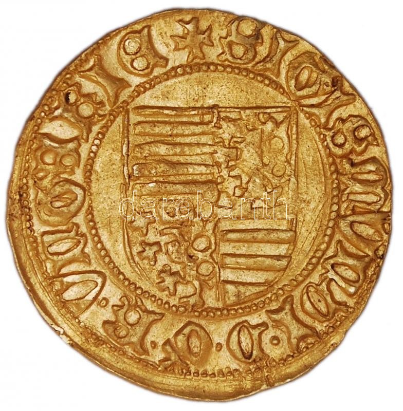 1387-1437. Aranyforint Au "Zsigmond" (3.63g) korabeli hamisítványa, nem létező verdejellel, a verőtő megugrásával keletkezett dupla-verettel! A forgalmi pénzekkel megegyező tisztaságú aranyból készült hamisítványok a korszakban zsákmányolt kincsek tisztára mosására szolgáltak. Ügyes kezű vésnök munkája. T:2,2- RR!