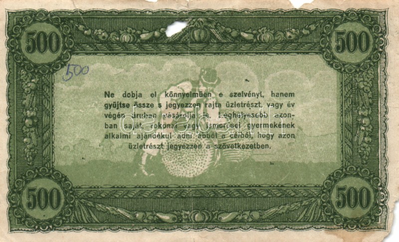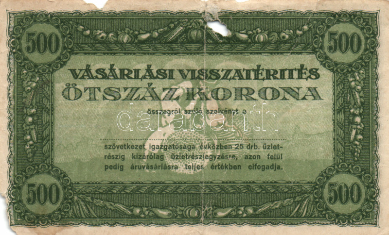 Leírás: 1920-as évek eleje 500K vásárlási visszatérítés T:III-